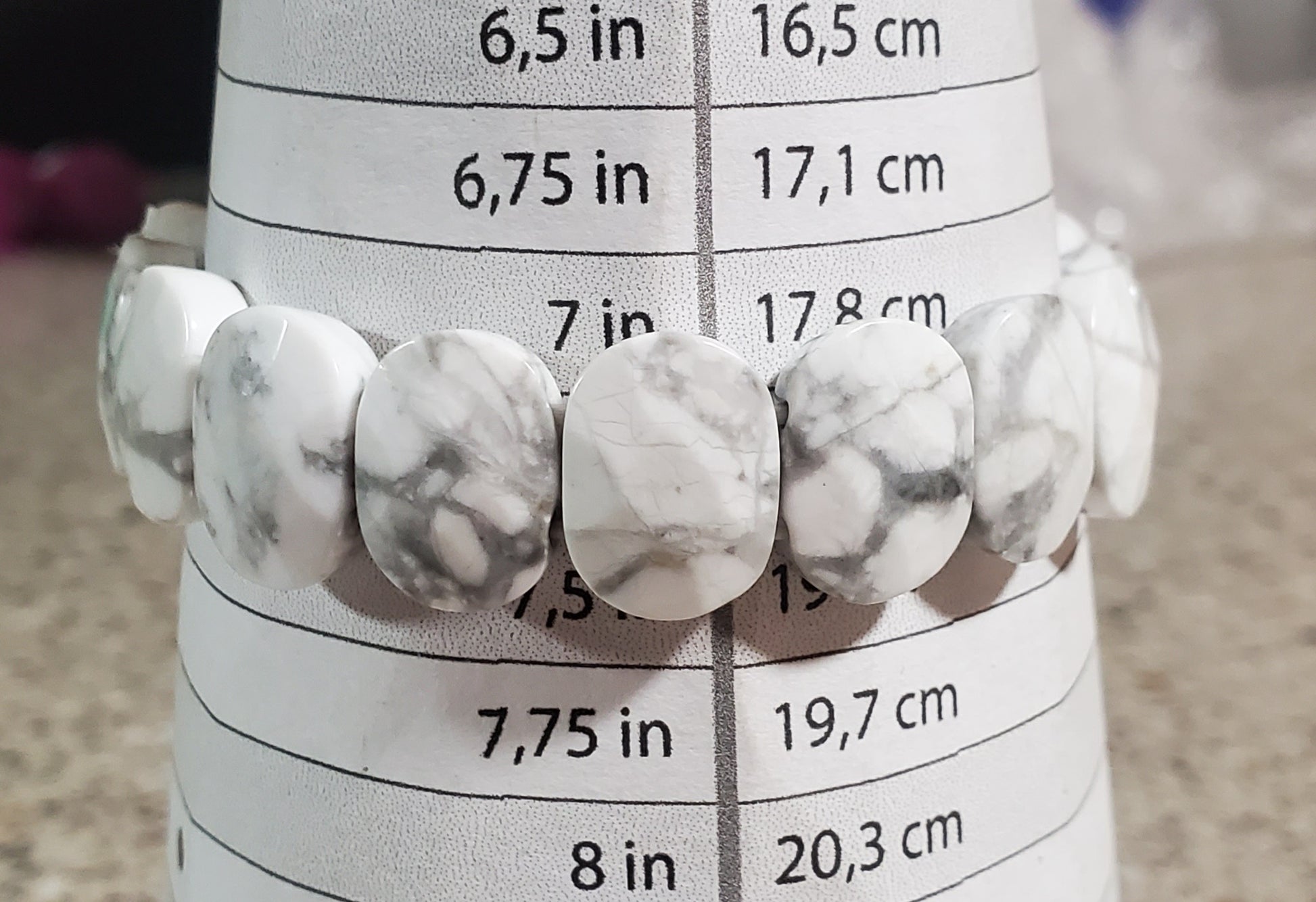 This lovely howlite bangle bracelet measures 7 inches.  It will stretch to go over your hand.