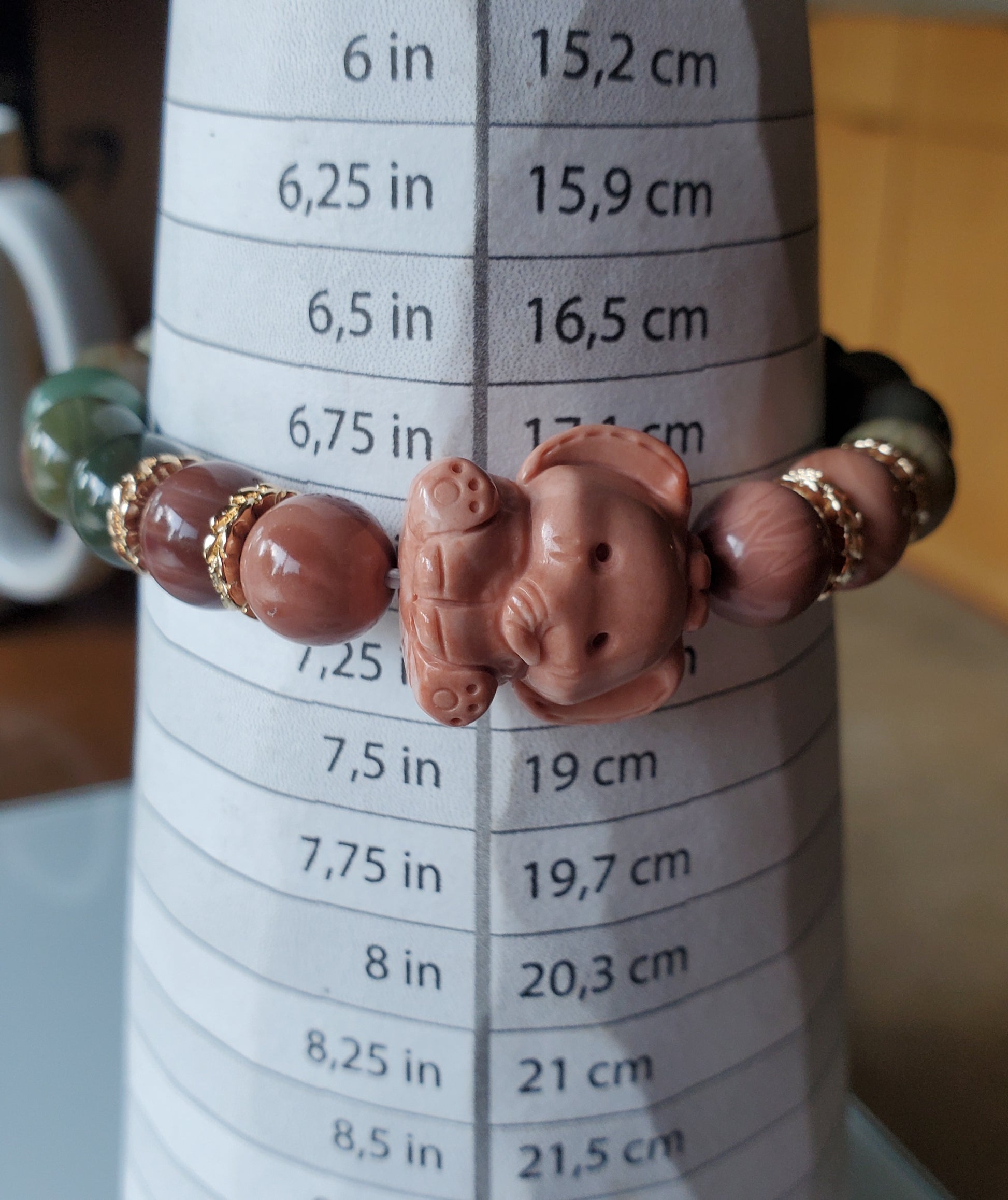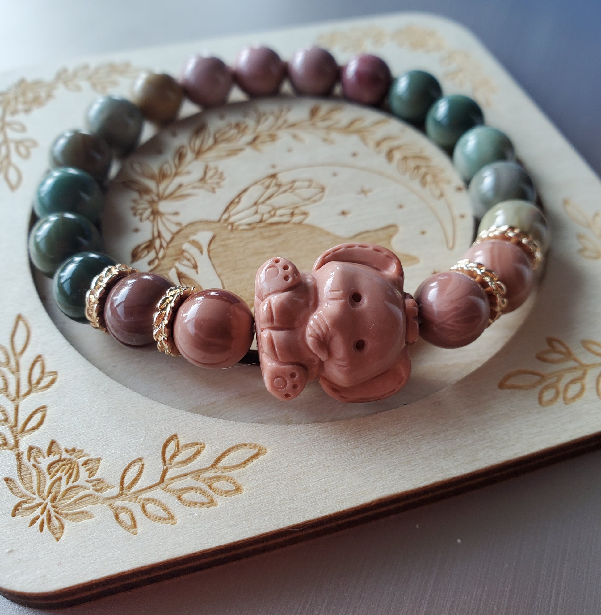 This bracelet is made with 9mm Alashan beads. The adorable elephant 🐘 charm is also Alashan. This bracelet is 6.75-7.0 inches in size.