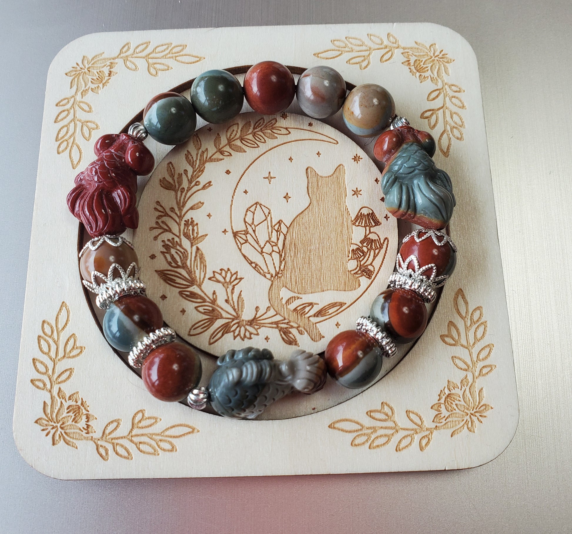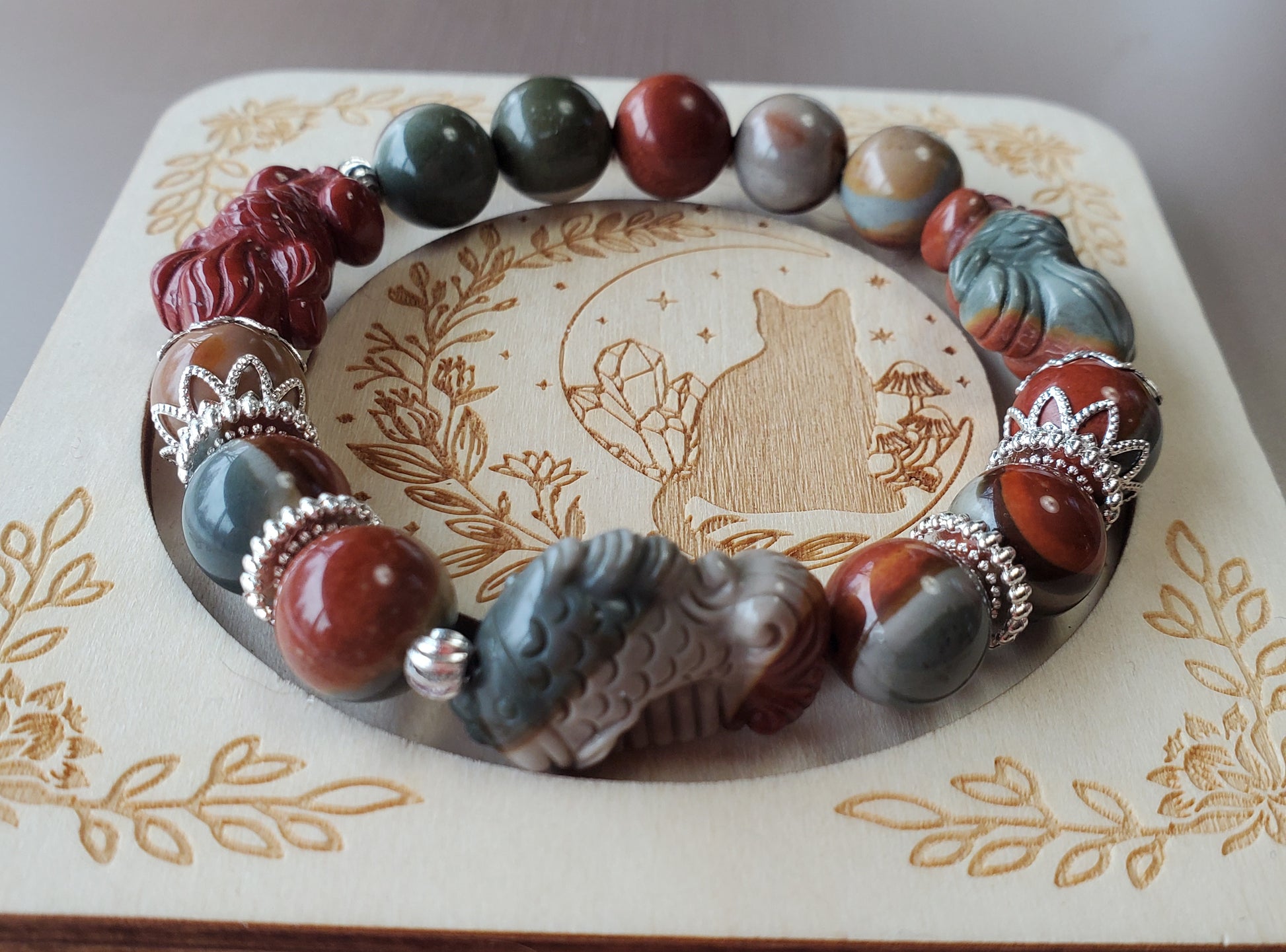 This lovely polychrome jasper beaded bracelet with 3 Alashan agate charms measures 6.75-7 inches.  The beads are 10mm.