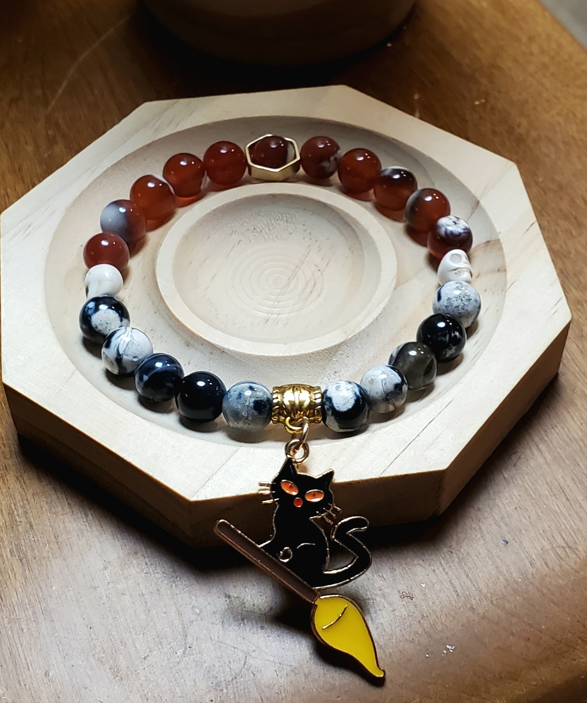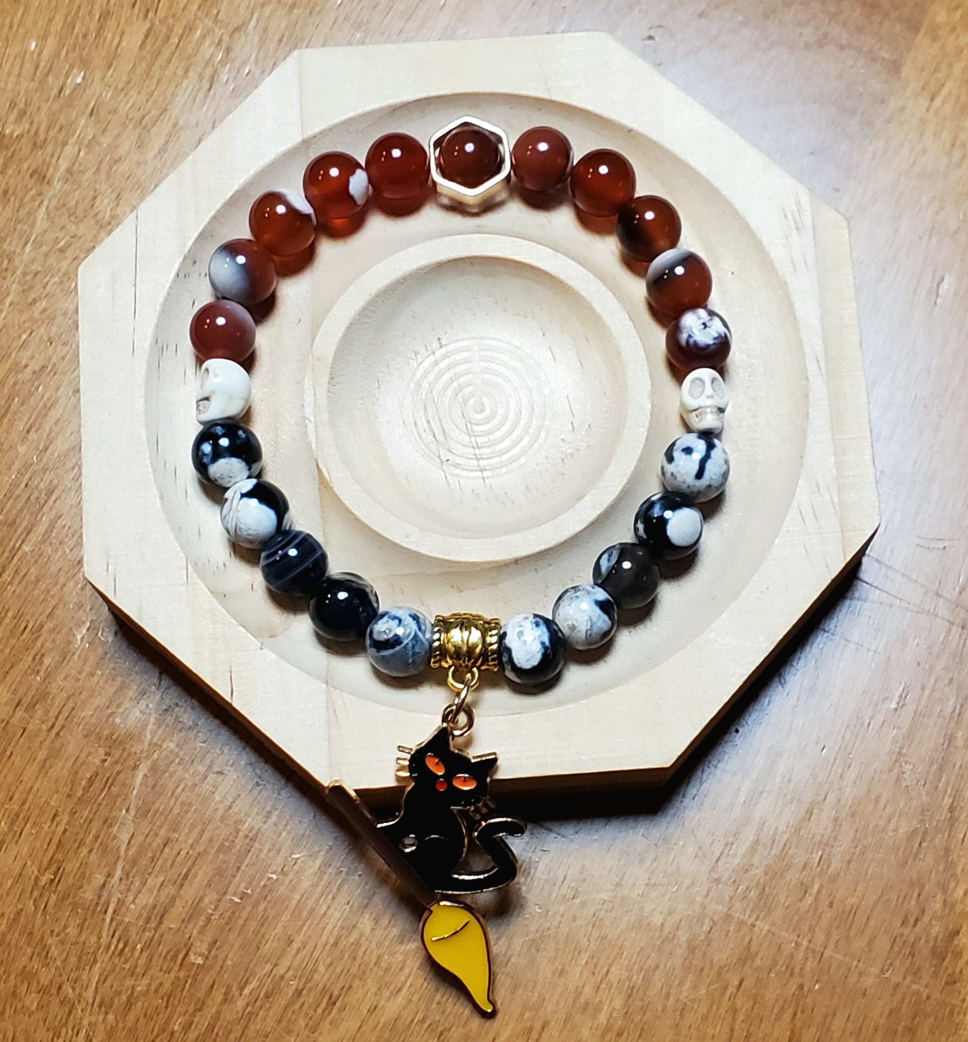 Black and red, 8mm orca agate with skull spacers and a cat charm. This bracelet measures 7.25 inches.