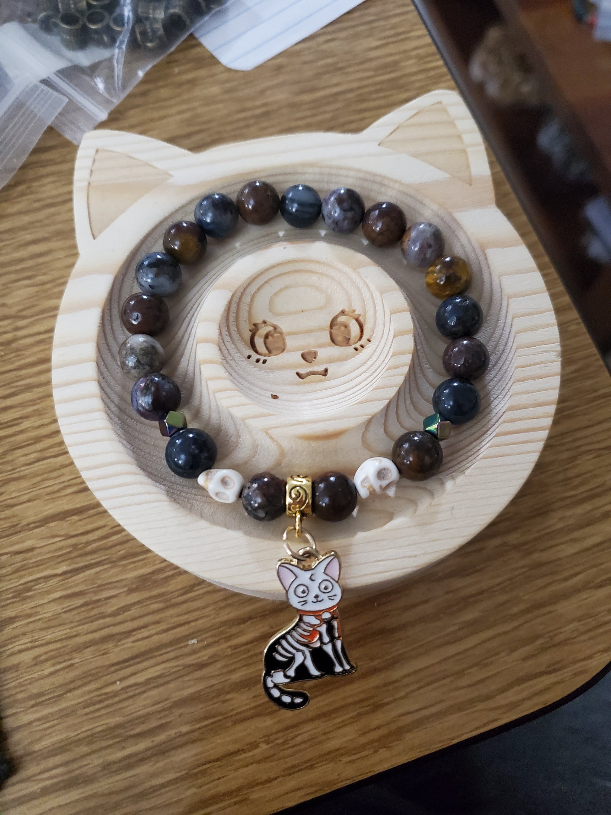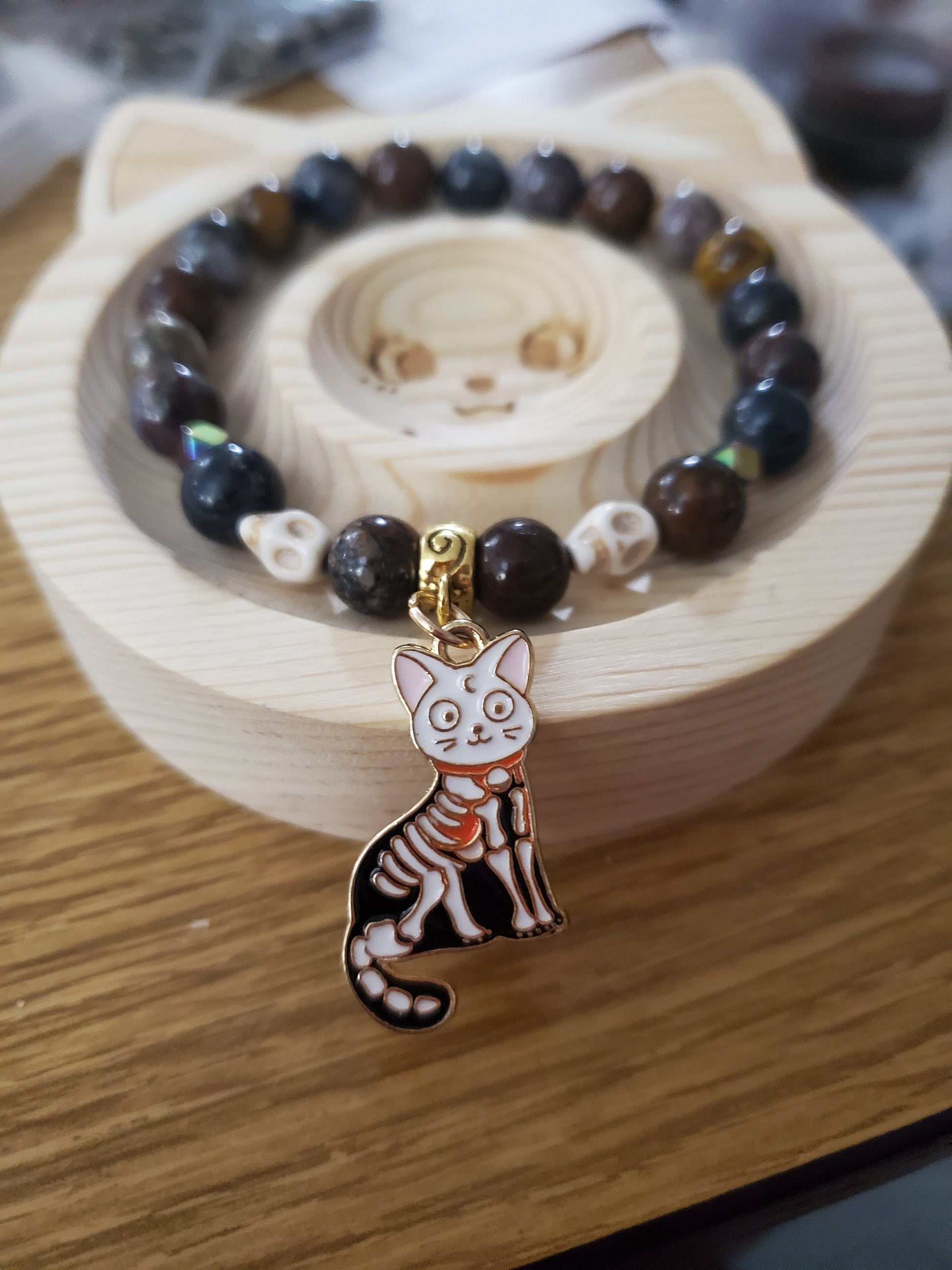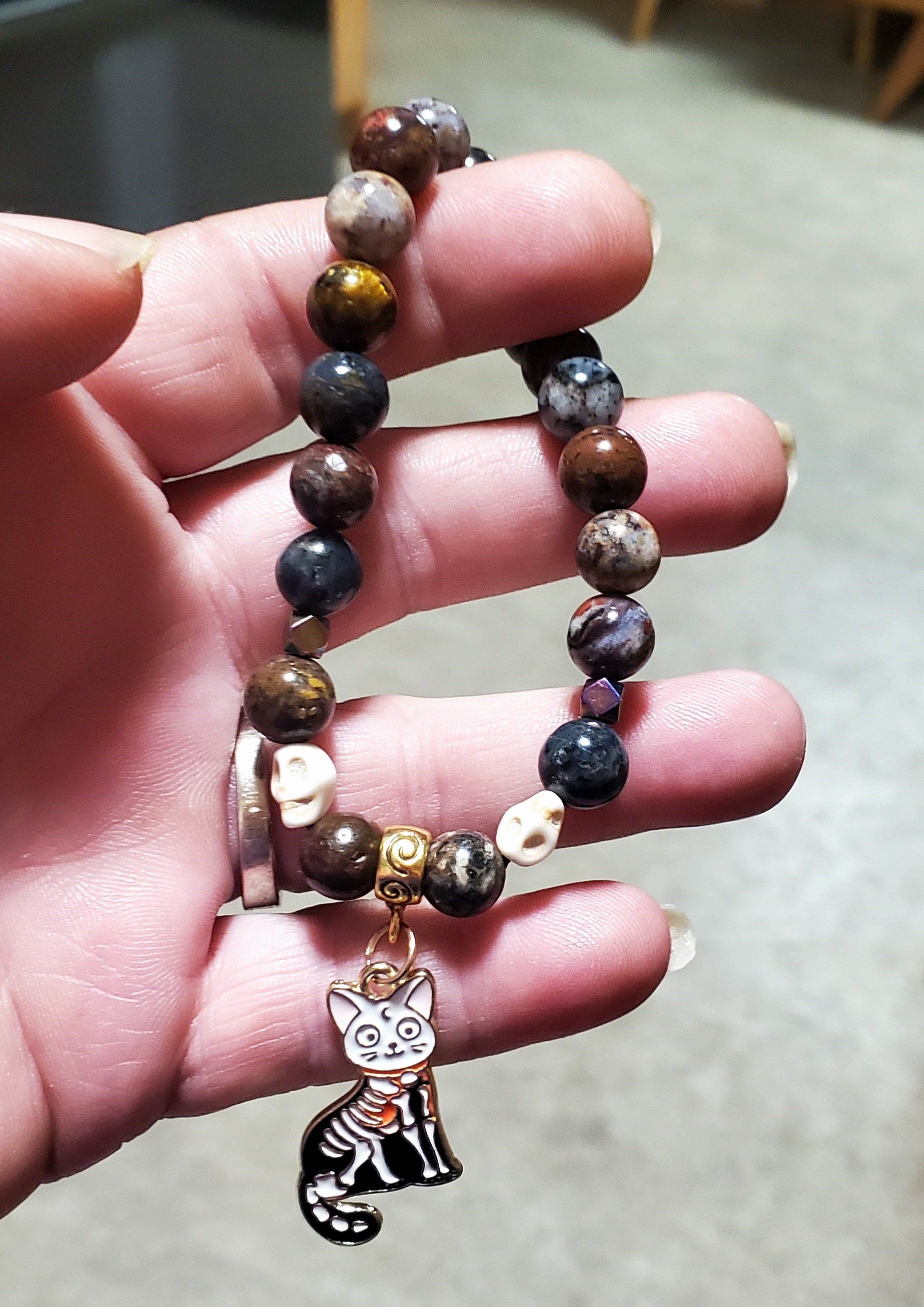 8mm multi-colored petersite beads with skull spacers.  The cat charm gives ideas for your pet's Halloween costume!! This bracelet measures 7.25 inches. 🎃 😉
