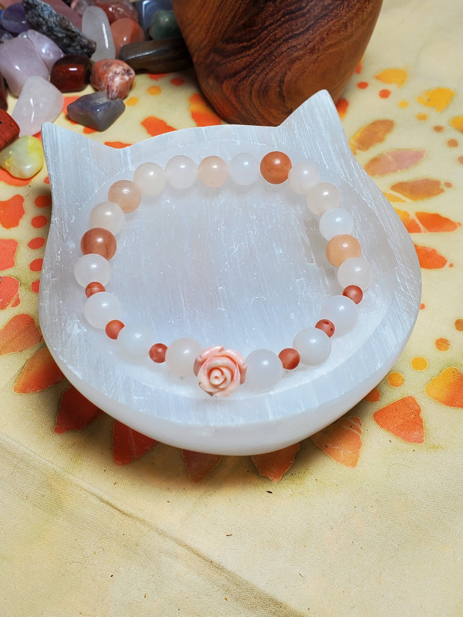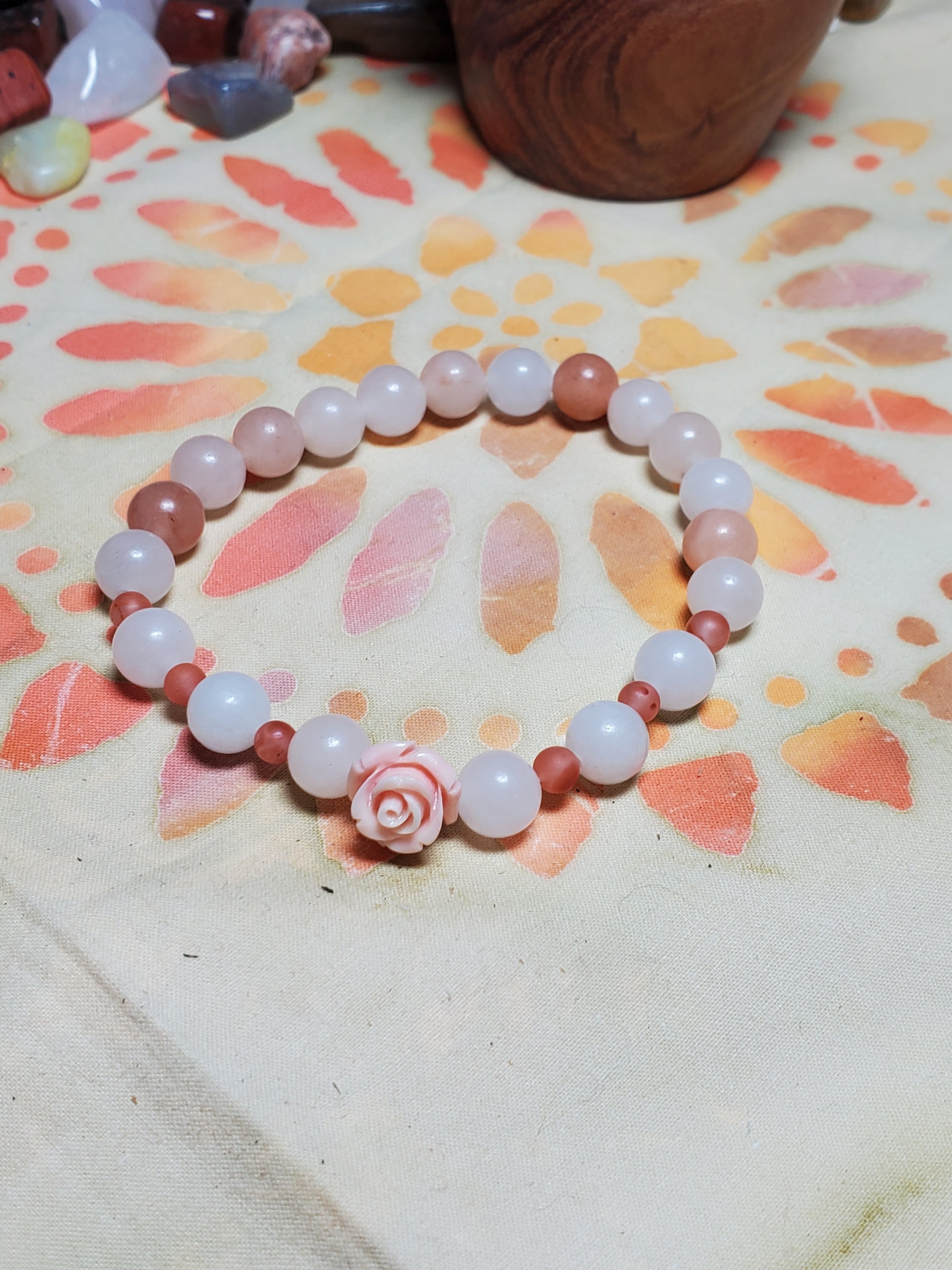 Orange Aventurine with Southern Red spacer beads and Shell Rose